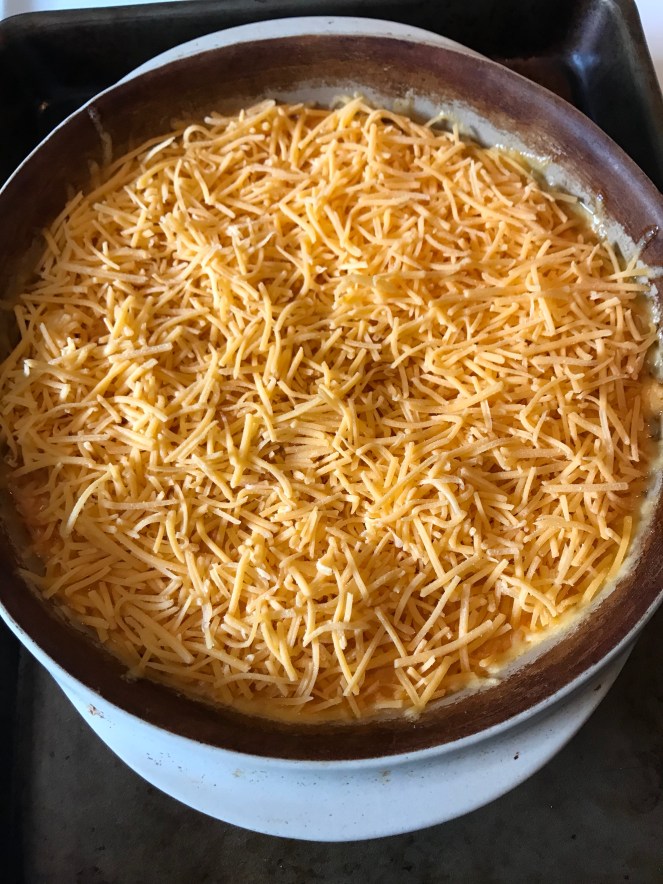 Place into a baking dish, and bake at 350 degrees for 20-25 minutes or until the mixture is hot and bubbly. Place the cheddar cheese on top, and return to the oven until the cheese topping melts.
