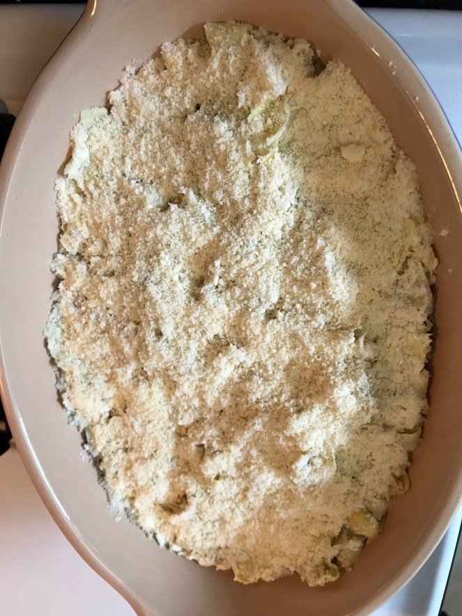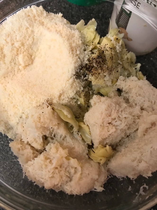 Artichoke and crab dip: 1 can artichokes in water – chopped, 2 cans of crab meat-drained (whatever kind of crab that is your preference), ground pepper, 1 cup of parmesan (and more to cover the top), lemon juice and about a cup of mayo. Again, I add the mayo at the end and may or may not use the entire cup. Mix together, sprinkle extra cheese on top, and bake at 350 degrees for 30-35 minutes or until cheese is golden brown on top.