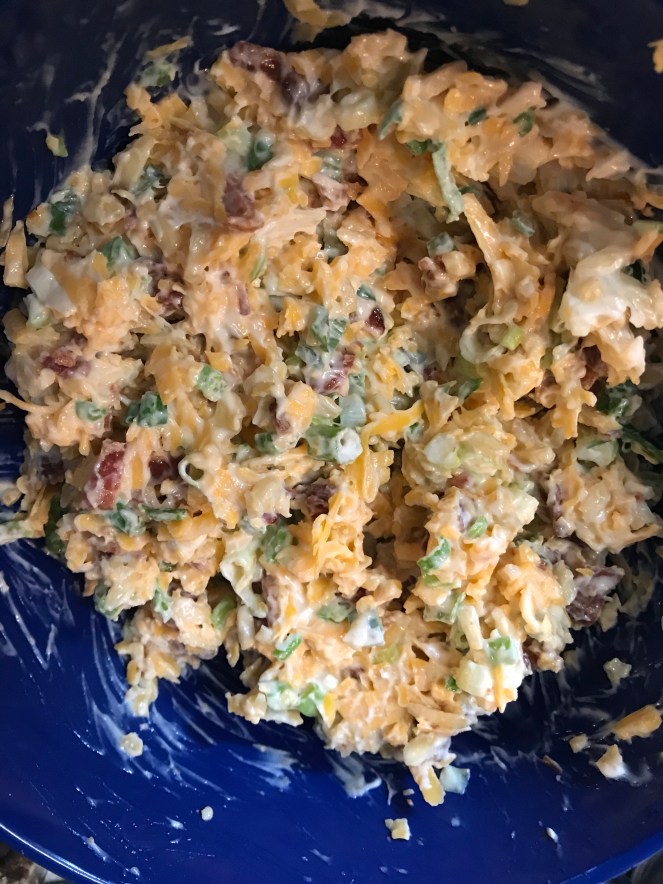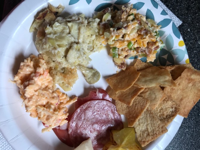 I made my pimento dip, million dollar dip and crab and artichoke (hot) dip. It was so yummy! I hated having to turn on the oven with it being 90 plus degrees outside. I haven’t made the crab artichoke dip in a long while. I don’t always seem to make it the same way…what we have on hand I suppose.