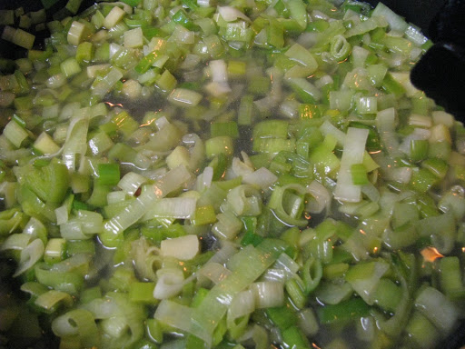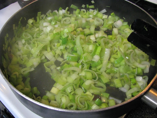 Add the leeks (3 large leeks, chopped and washed -thoroughly wash), and saute until limp.