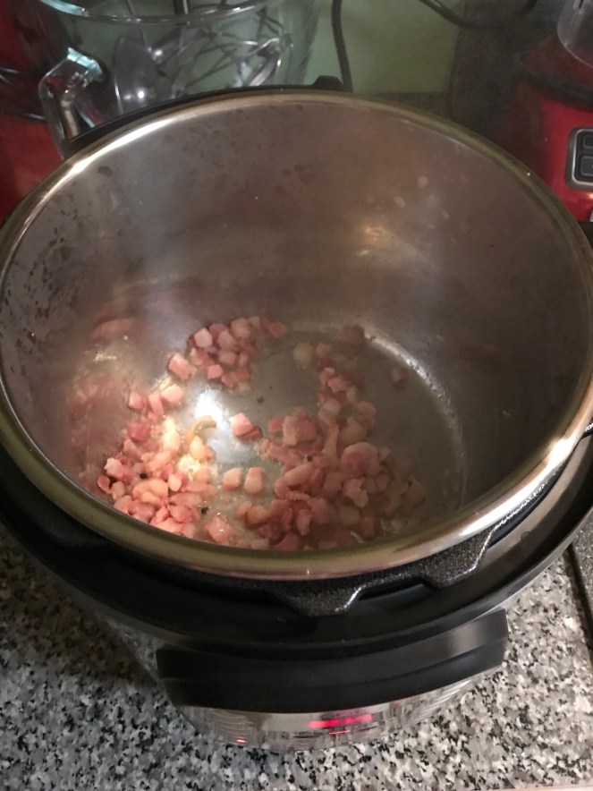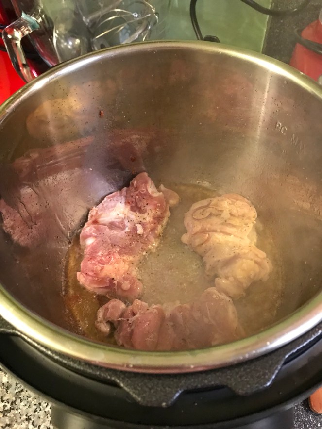 Pat the chicken thighs dry, then season with Season Salt, Pepper and Garlic Powder. Sear chicken on both sides, and remove from the Instant Pot.