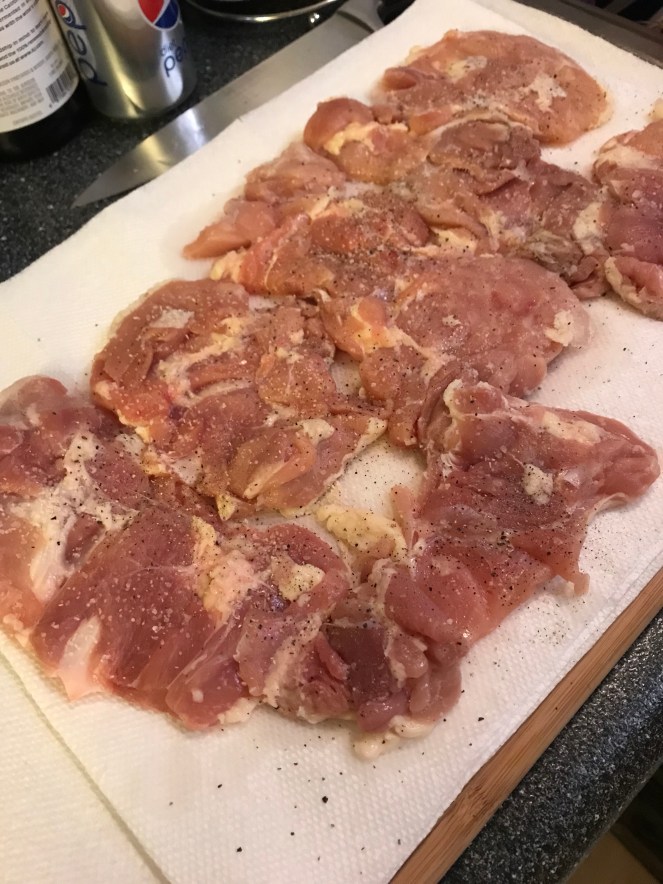 Trim away as much fat as possible. Sprinkle with the dry seasoning. Coat completely.