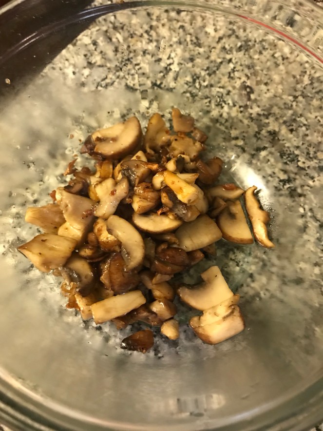 Remove from pan – do not drain pan grease. Add garlic to pan, stir well. Add mushrooms to pan, stirring occasionally to keep mushrooms and garlic from burning. Add second half of butter to pan, let melt. Let garlic and mushrooms brown – about 4-6 minutes.