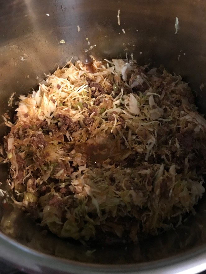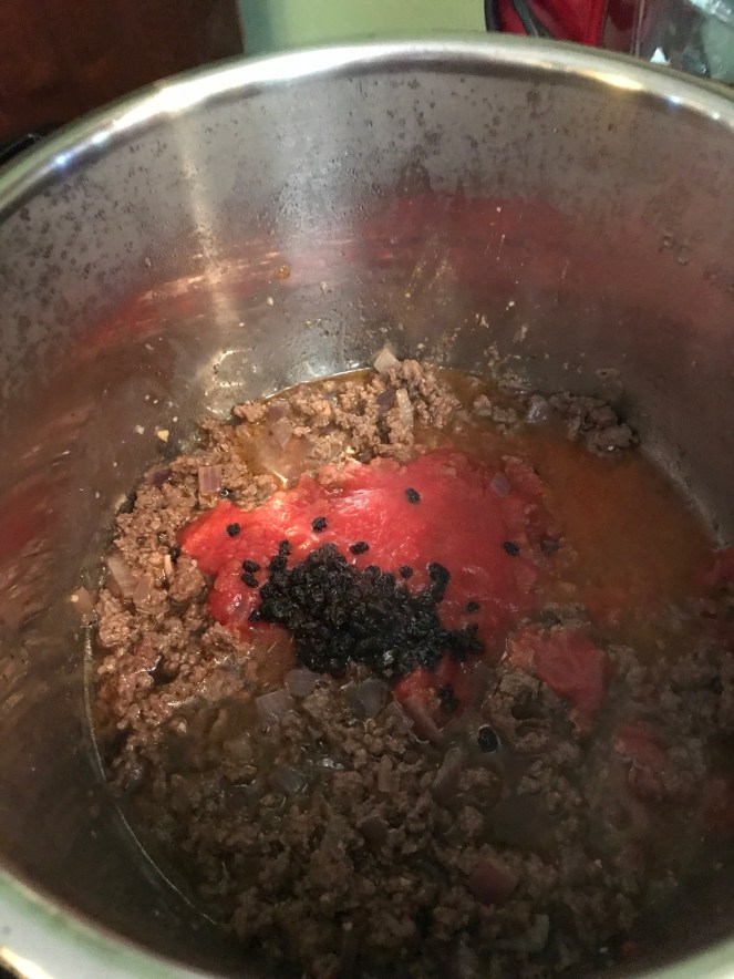 Add the tomato sauce, paprika, beef broth and raisins (we used currants), cover and cook high pressure 15 minutes.