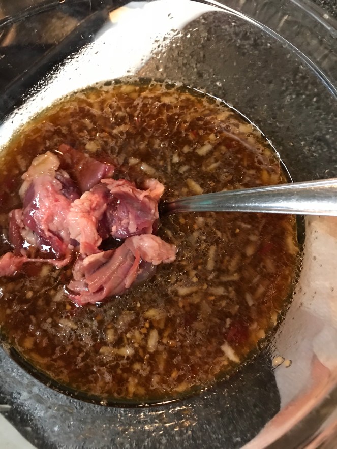 Placed the marinaded beef in a Ziploc bag and placed it in the refrigerator for 4 days (due to time management and other things going on –we didn’t cook).