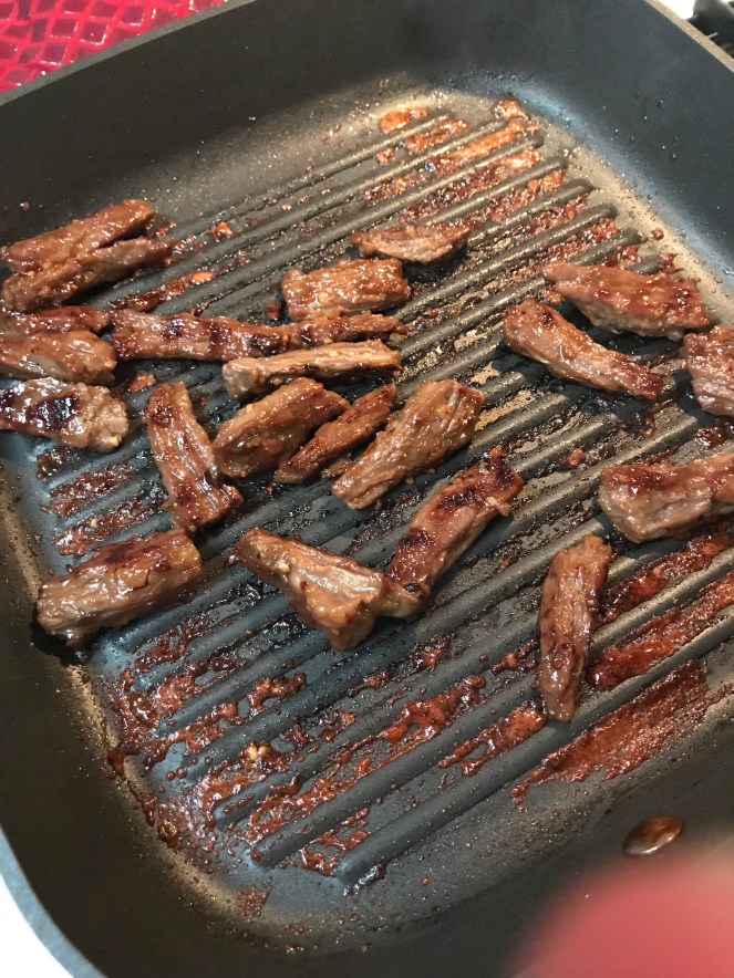 So, when we finally decided to cook…ha. I sauteed the carrots, and onions until cooked. Then seared the steak (one to two minutes per side).
