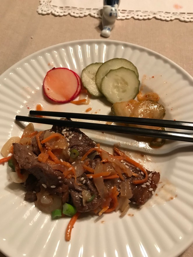 The beef was super tender (as it should be just with the cut of beef), and then marinating for 4 days – ugh. But the flavor was amazing, if I do say so myself. I so will be cooking this again. I will say that I need to cook the onions on higher heat with more soy sauce? Not sure but overall super yummy, and it satisfied my cravings.