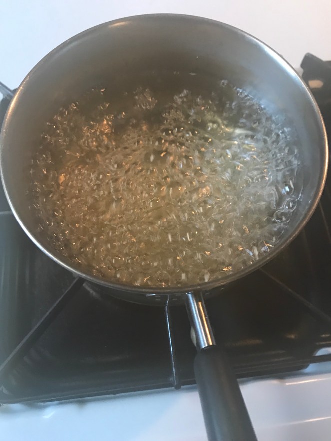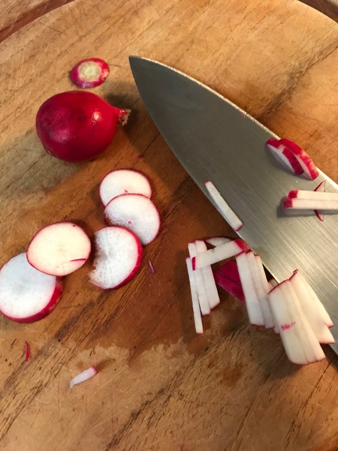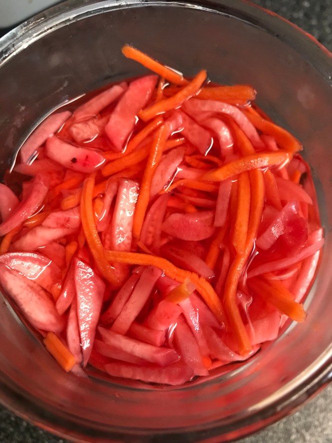 Bring to boil, (1) one cup rice vinegar, (1) one cup water, 1/2 cup sugar, and a good pinch of salt. Pour over radishes and carrots in a glass dish. (Please be careful doing this…)