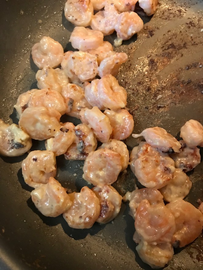 Open two of the cheese wedges, and add into the pan with the shrimp.