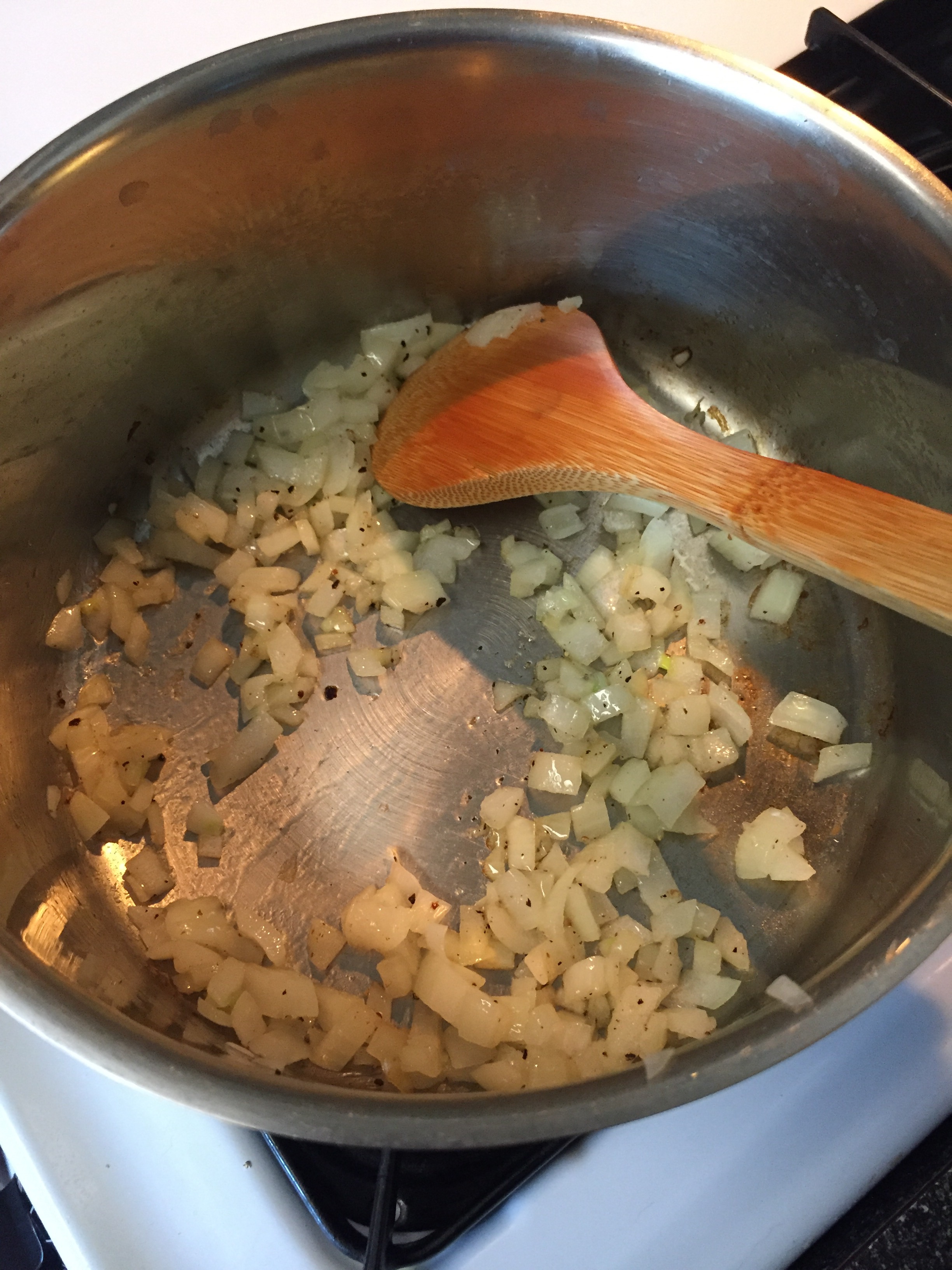 While the chicken cooks, saute the onion until milky then add the baby portobello mushrooms.