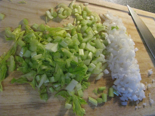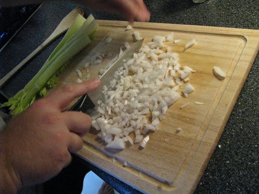 Then chop 1 medium yellow onion (or any other kind of onion that you like), and about 4 stalks of celery. My hands were hurting, so David (my wonderful hubby) did the chopping for me.