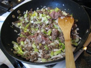 Start browning hamburger meat, celery, and onions until hamburger is browned and the onions are translucent.