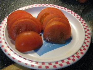 Slice some tomatoes (my plants have grown and have yet to produce fruit) so these are store bought, but still good.