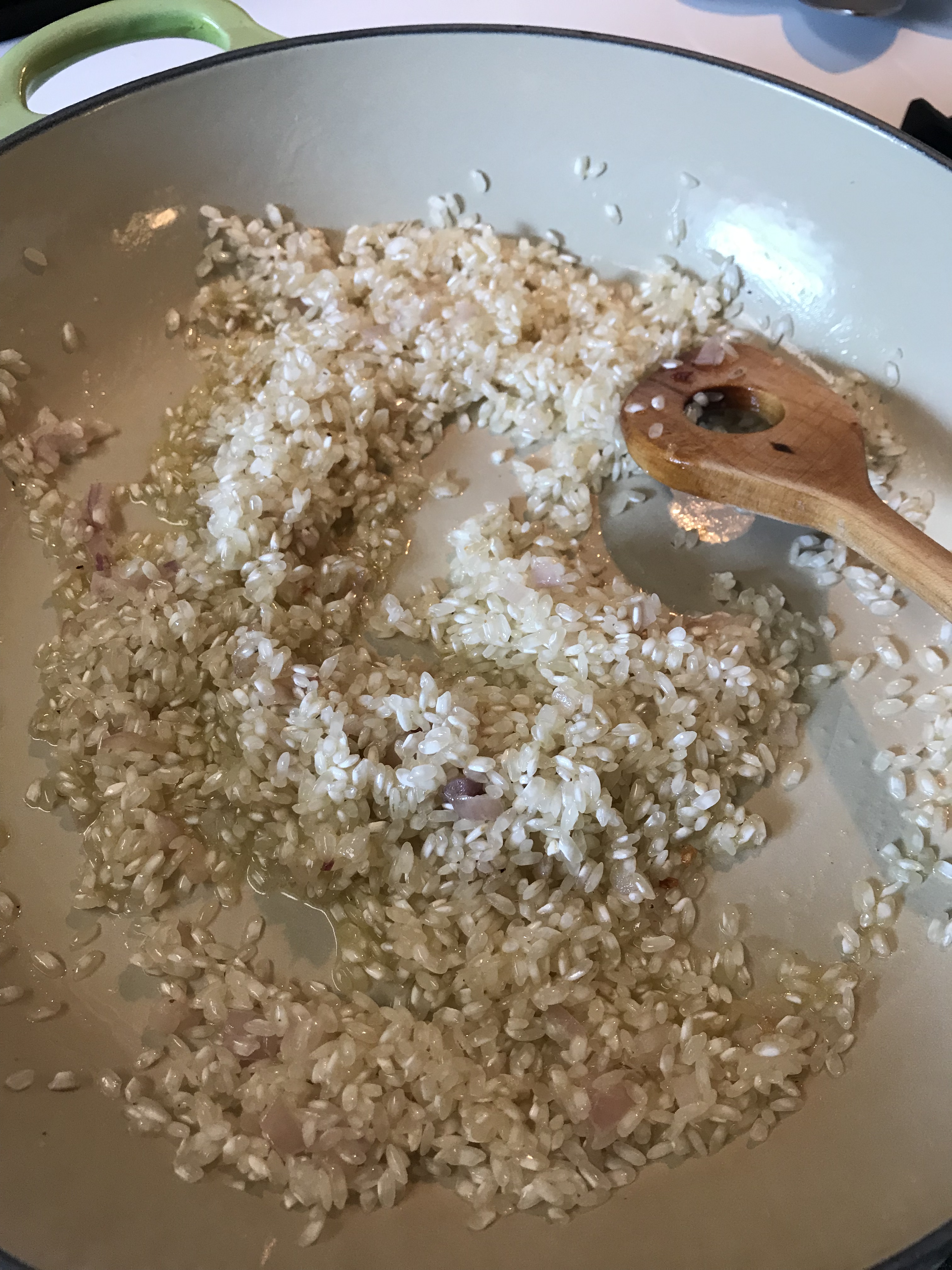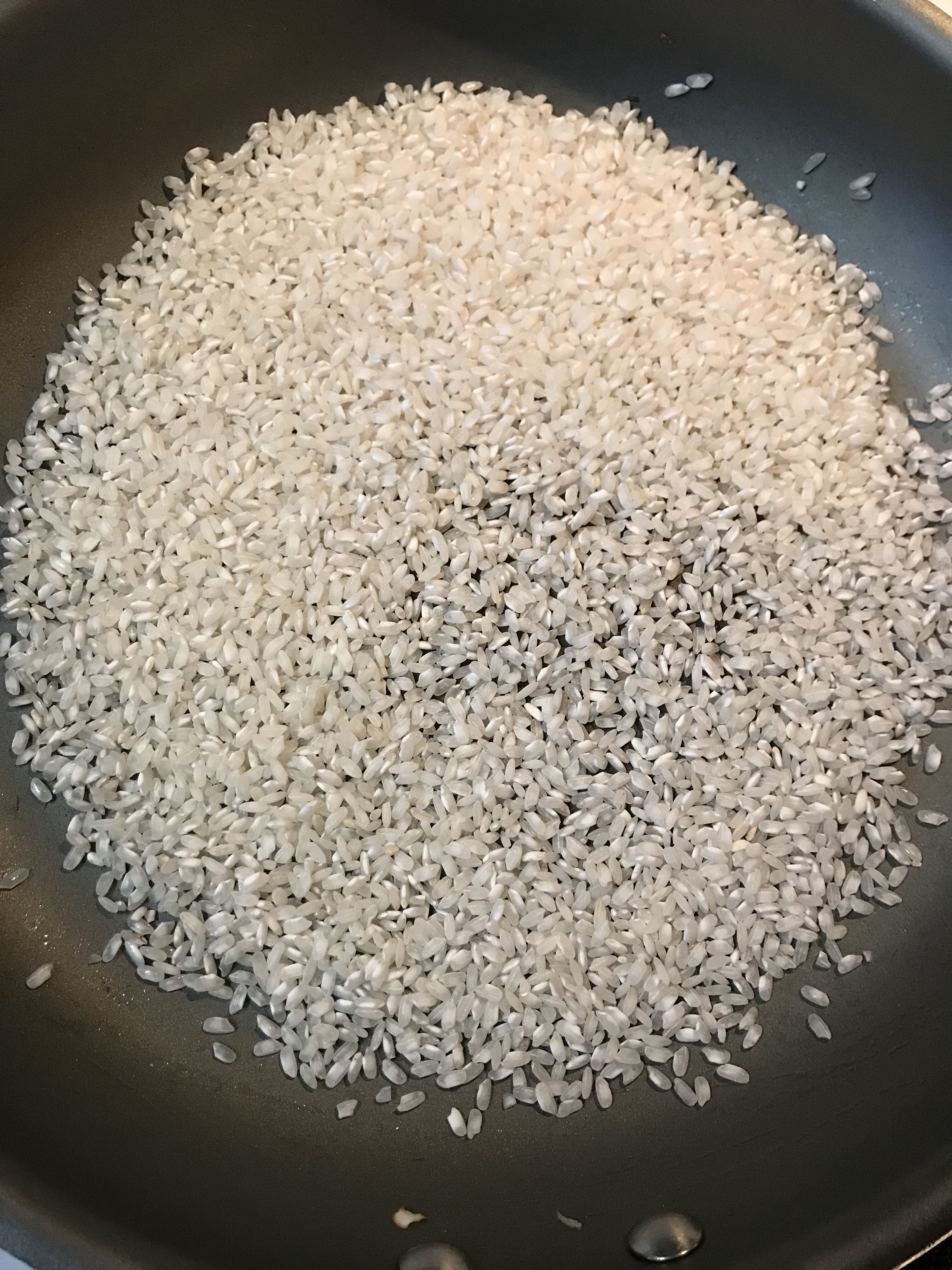Everyone seems to think that risotto is hard, and it can be, as you have to constantly stir and tend to it. But if you are willing to do that, this dish is wonderful. Start by adding Arborio Rice to a dry skillet to toast for about two to three minutes or until the rice is warm.