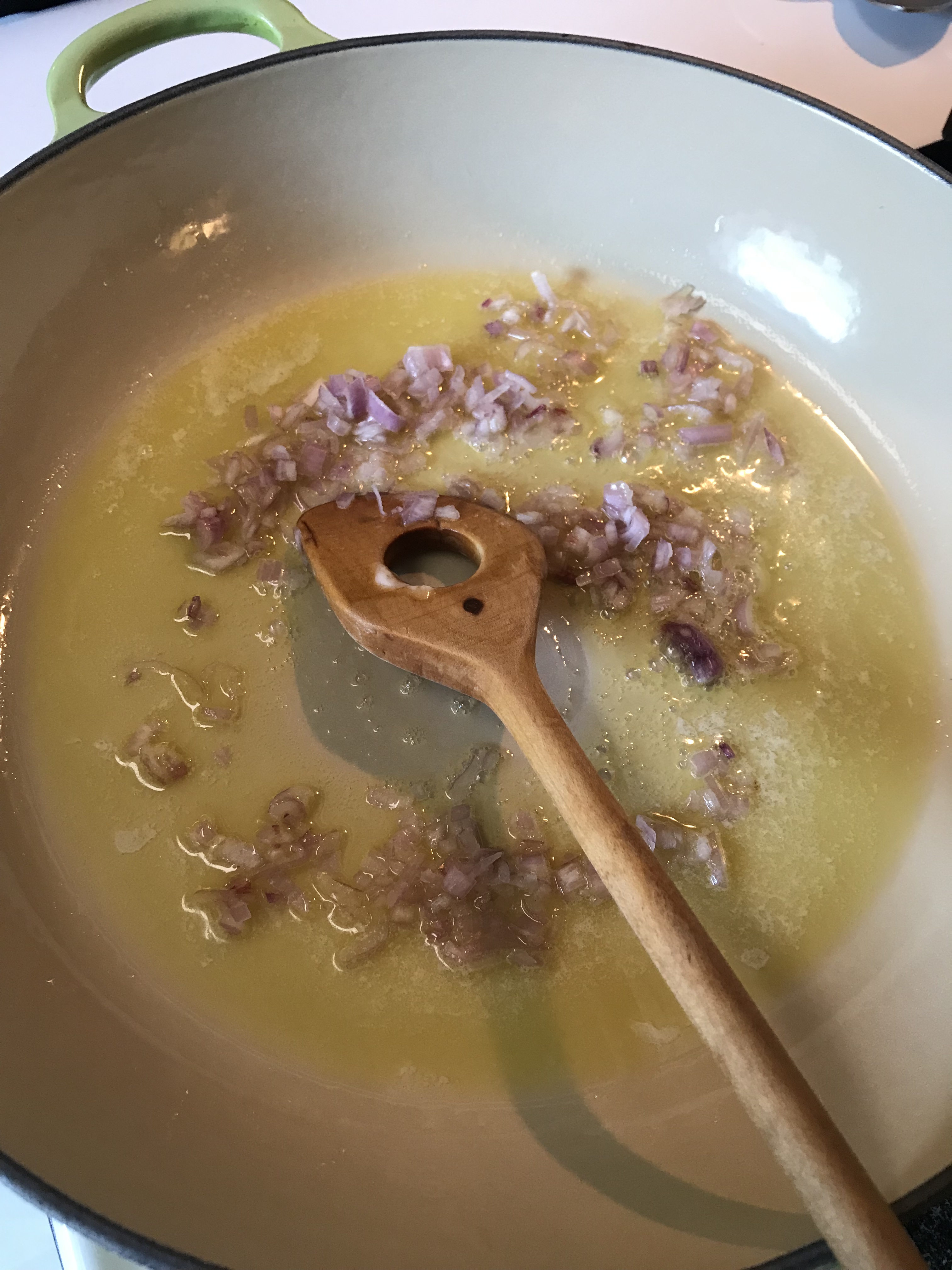 Melt three tablespoons of unsalted butter and add a large, finely chopped shallot.