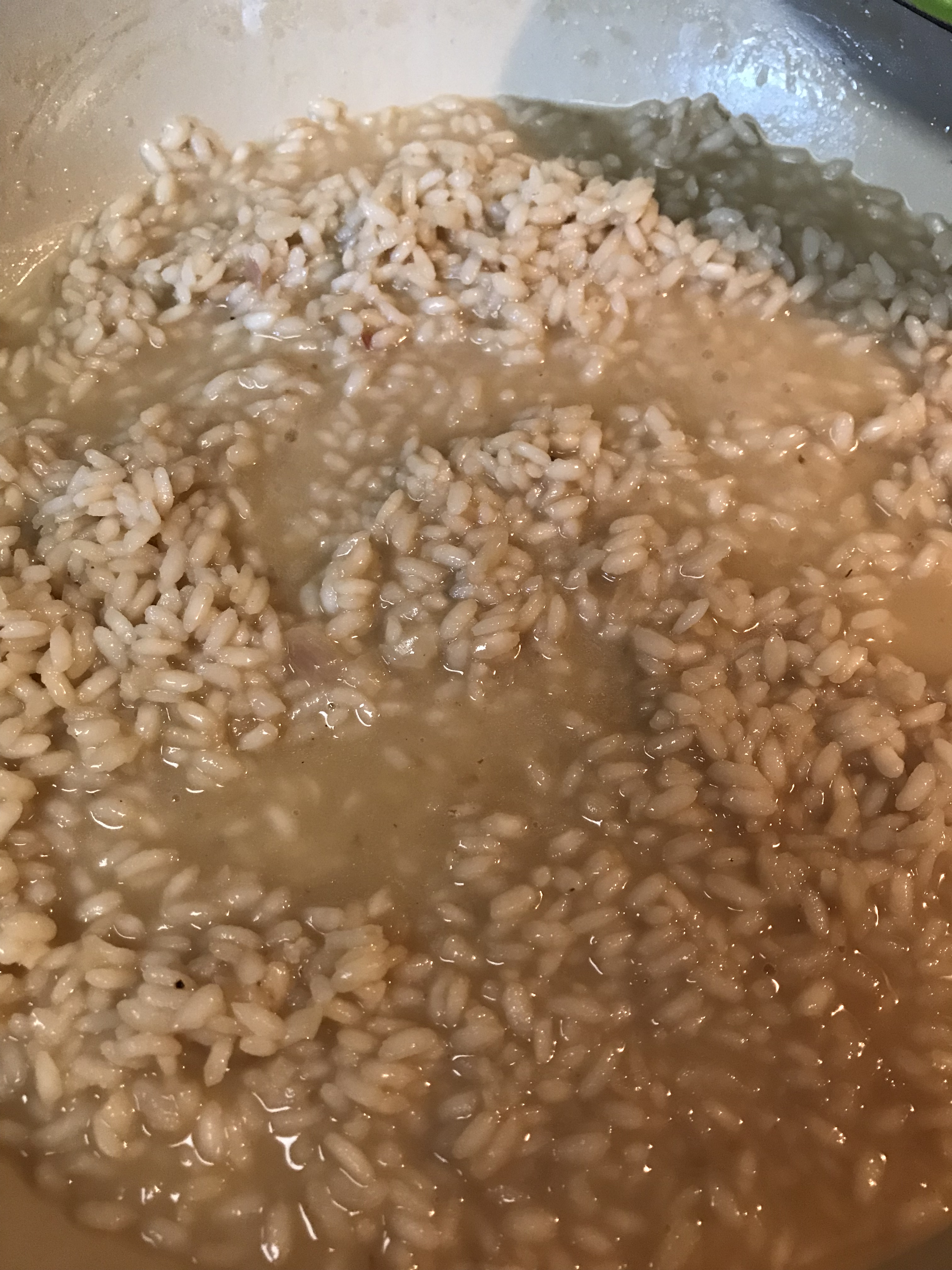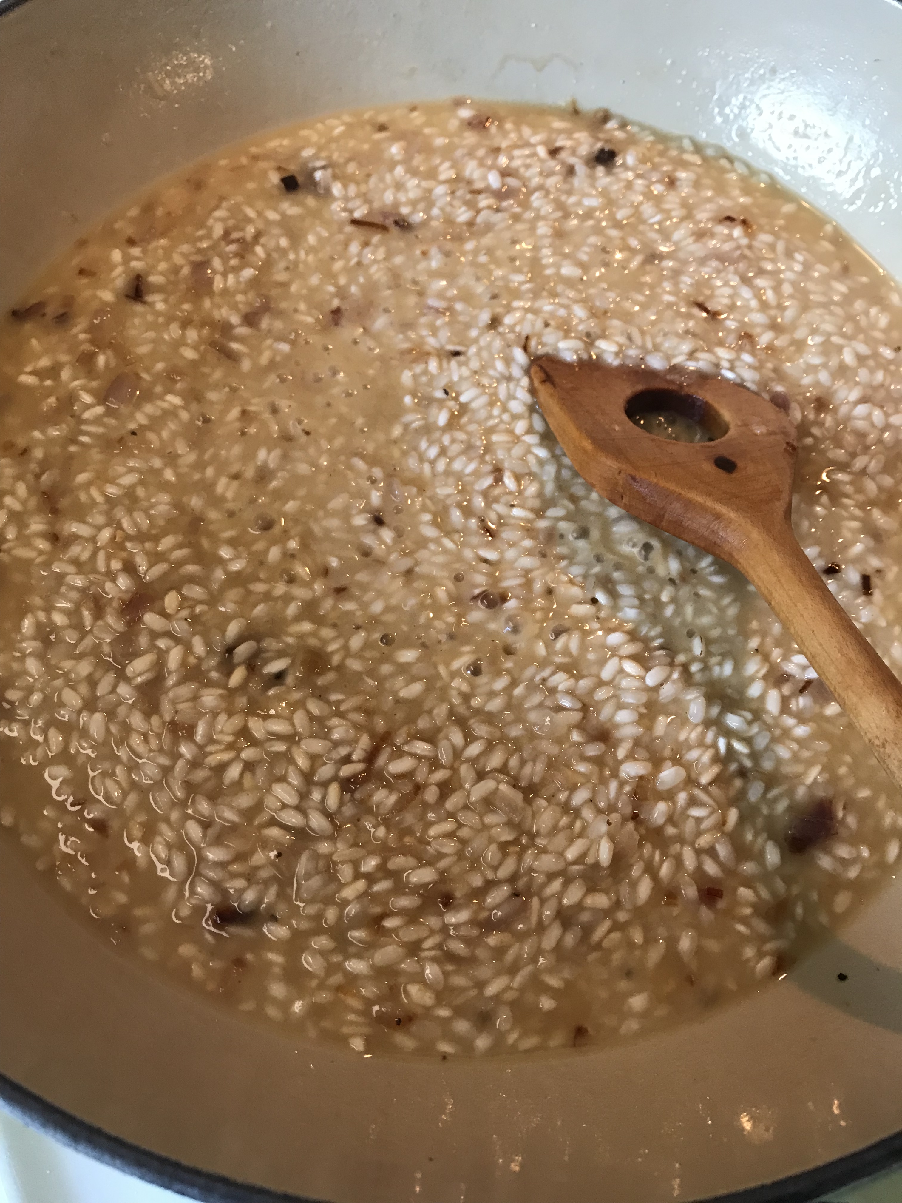 I also added four cloves of roasted garlic (smashed). It adds a nutty flavor and isn’t in your face garlicky. Add about a half of cup of liquid at a time, and stir until adsorbed.