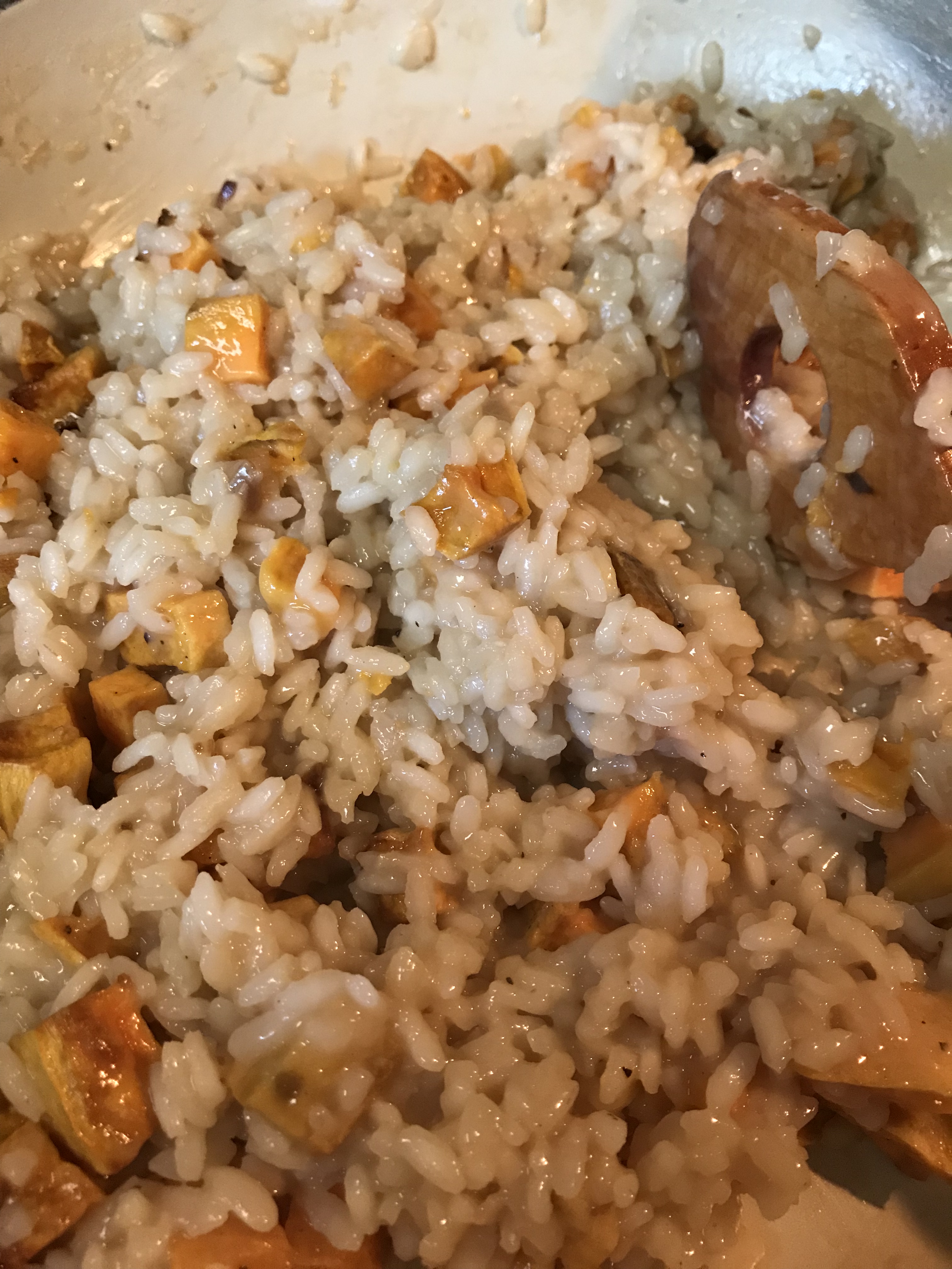 A simple risotto with one sweet potato (chopped and roasted with olive oil, salt and pepper for about 25 minutes at 350 degrees).