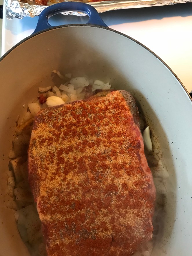 I seasoned the chuck roast with salt, pepper, season salt, and lots of paprika. Place in the pan to sear with 4 cloves of whole garlic.