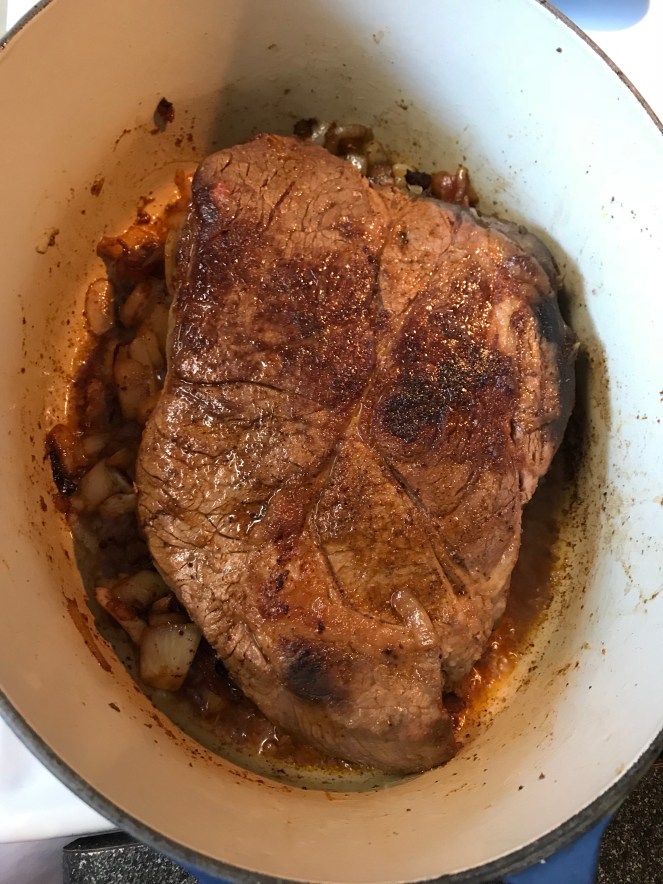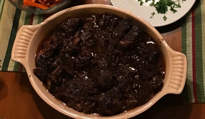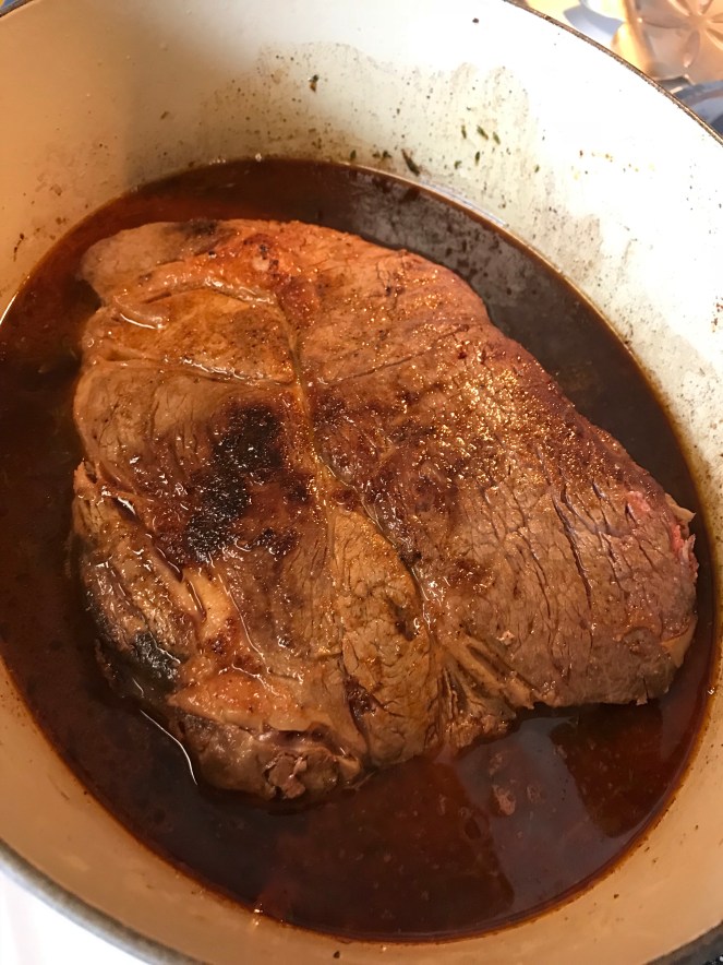 Braised in the oven for about three hours at 325 degrees.