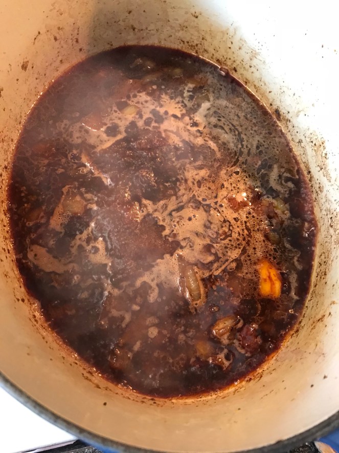 Add 2 cups of red wine (one that you would drink, this is a Cab), and about 2 cups of beef stock. Also, add 10-12 small sprigs of fresh thyme. You can either leave the leaves on the tyme or remove them. I remove them so I didn’t have to worry or think about it later. Bring to a simmer, and then add the meat back to the pan.