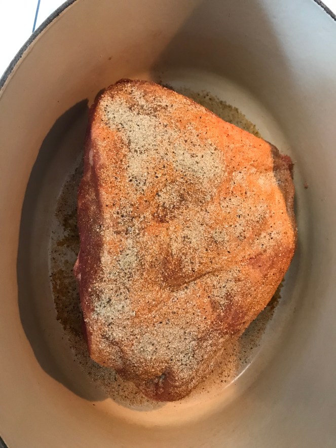 Searing the pork roast on all sides with a liberal seasoning is important. “Brown food is good food.”