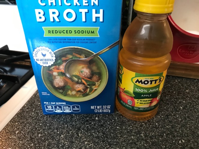 Then added a small bottle of Apple Juice, and about two cups of reduced sodium Chicken Broth. Bring to a simmer, and cook for approximately 20 minutes.
