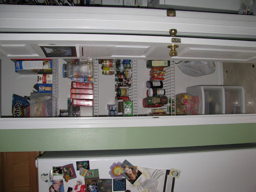A two drawer system (that I found in the garage), and some other tubs (that I can’t find the lids) organized the chips and pasta. All of my baking ingredients are on one shelf (sugars, cocoa, marshmallows). It may not look like much, but, oh what a beautiful sight it is for us.