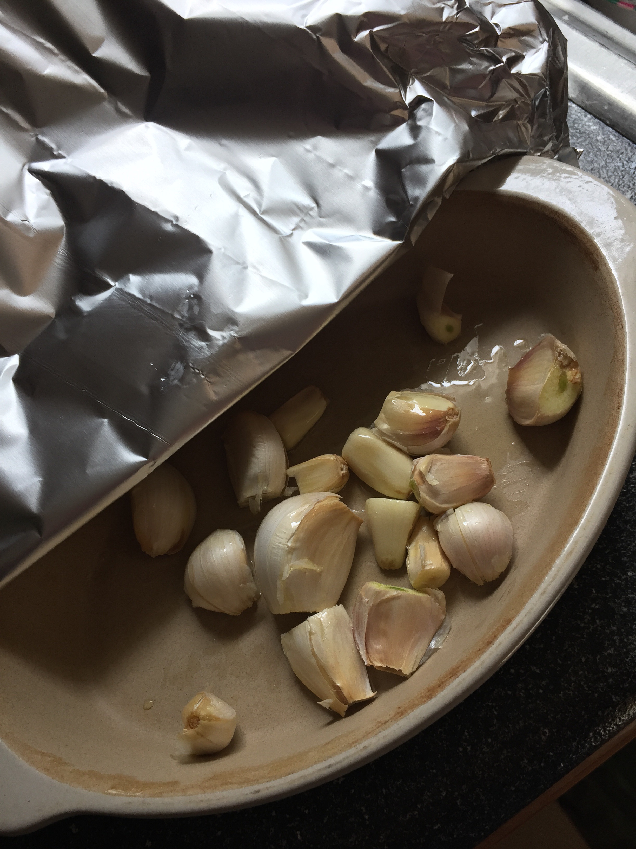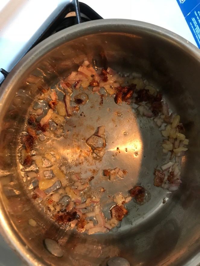 I had some roasted garlic cloves, and some raw ginger. I added them to a small pot with about a quarter cup of onion with some olive oil.