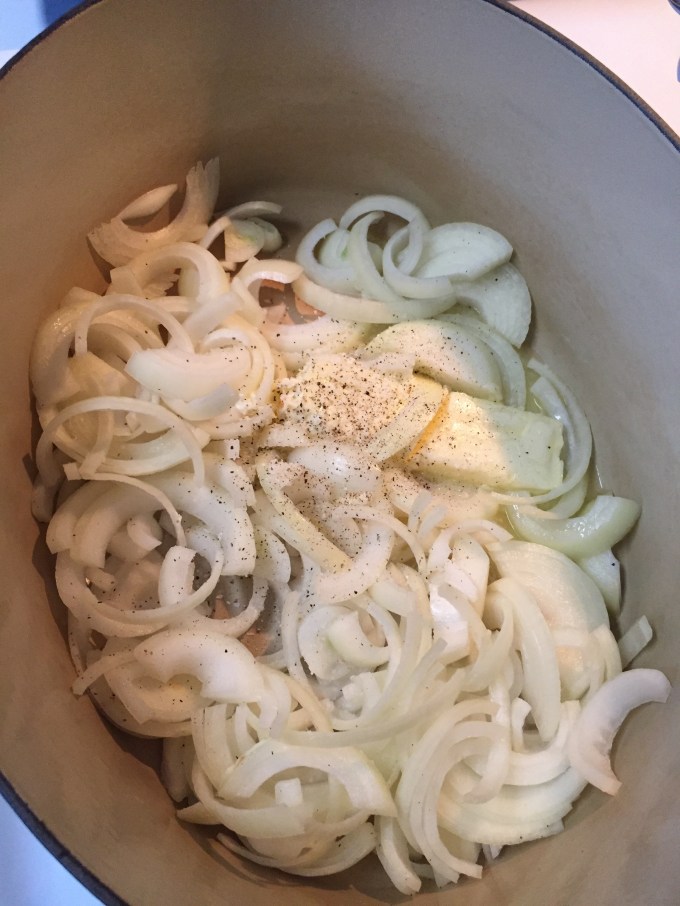 Add 4 cups of beef stock. Bring to simmer, and cook for about 10 minutes.