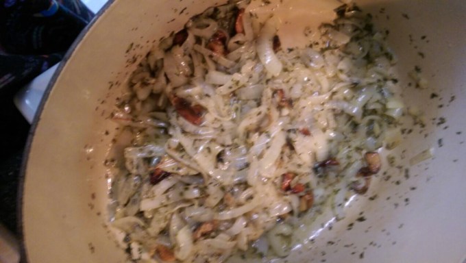 Saute until the onion is translucent. Add 3 teaspoons of dried parsley, 1 teaspoon thyme, 1 teaspoon oregano and a bay leaf. Add peeled garlic.