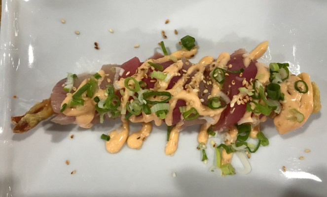 2 pieces of shrimp tempura wrapped in 3 ounces of yellow tail with spicy mayo and green onions (with a little bit of eel sauce).