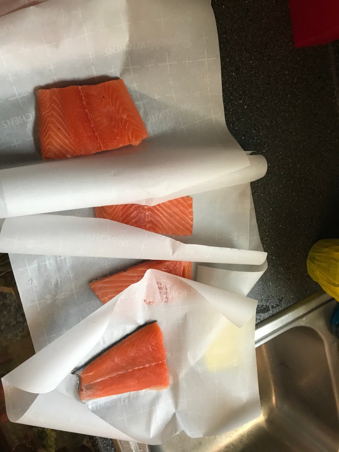 Cut the Salmon into equal portions (I didn’t weigh them), and place them in parchment paper cut to approximate size (you will need to measure before cutting to ensure that the paper will close tightly).
