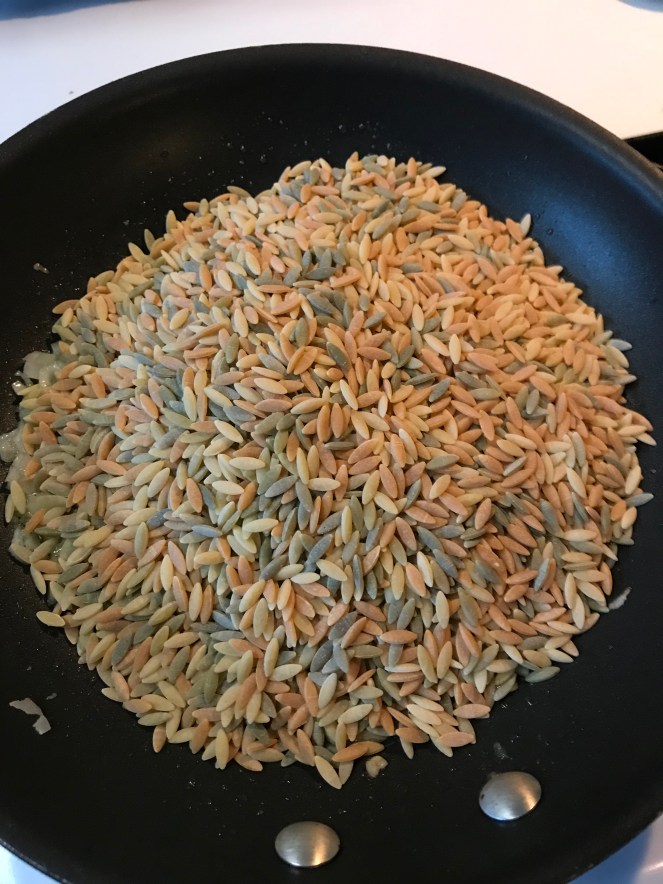 Add the dried Orzo to the pan, and saute’ until bits are browned. Gentle stir to coat the orzo with the oil on a medium high heat.