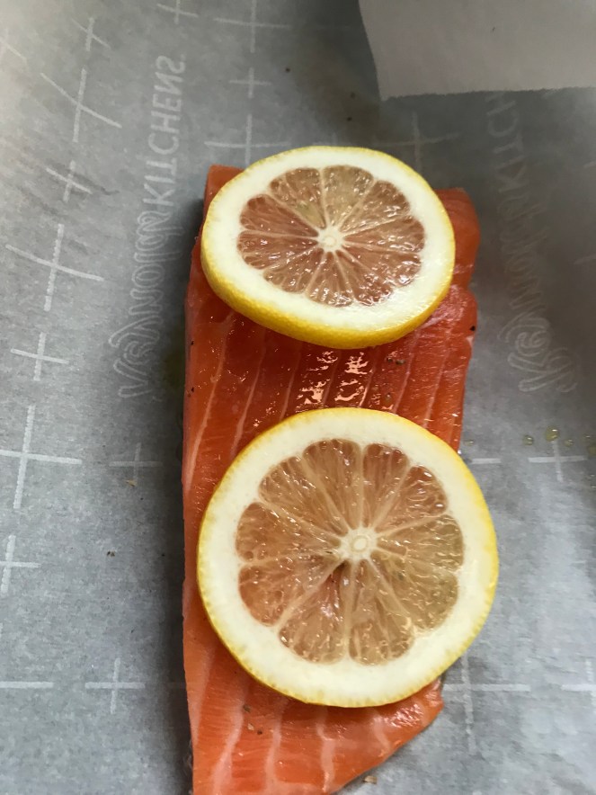 Salt, pepper, a bit of olive oil, and two slices of fresh lemon on each piece of Salmon.