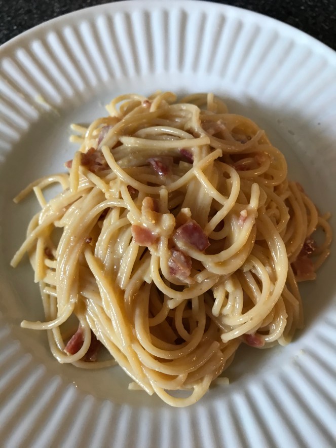 Cravings can be a wonderful thing especially for me in the kitchen. When it gets cold outside, I want to be in the kitchen. Cooking makes me happy. I enjoy it. I was craving spaghetti carbonara. Again, a pretty simple dish, and one that I normally have the items in either the pantry or the fridge.