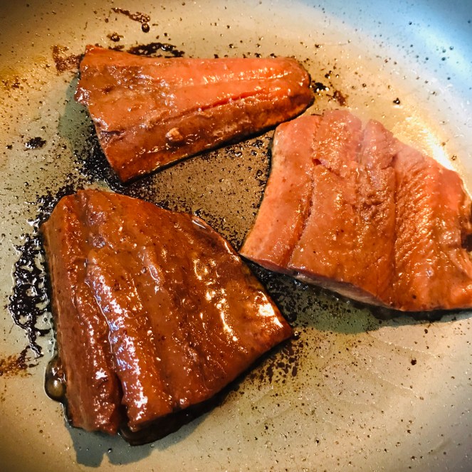 Hint from Gordon Ramsey: score the salmon skin before cooking will ensure that the fish won’t curl up during cooking. It worked (like I question him and his suggestions – ha).