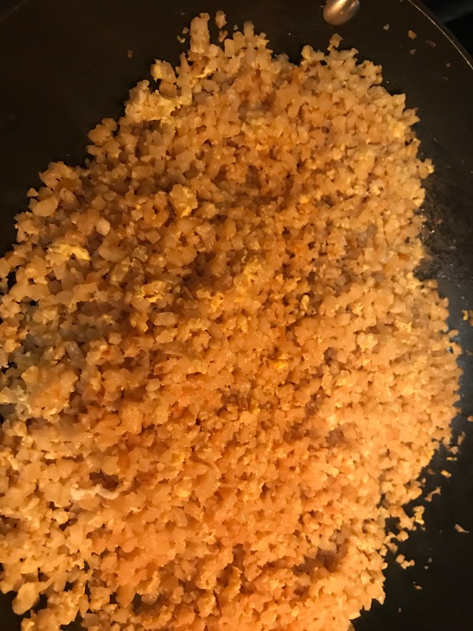 Make a well in the middle of the pan. Beat two eggs and add to the well. Stir quickly, incorporating the rice. Continue to stir and cook until the eggs are cooked.