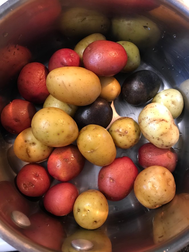 When the potatoes are done (fork tender), drain, and let dry on a sheet pan for about 5-8 minutes (do not pat dry or wipe off the salt).