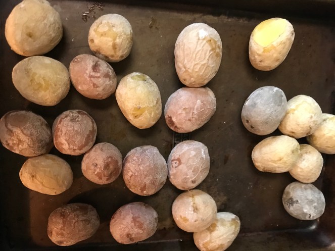 These are NOT salty at all. I will add black pepper next time, and fresh chives, but for items we had on hand–supper yummy. I served these with a rib-eye steak and salad.