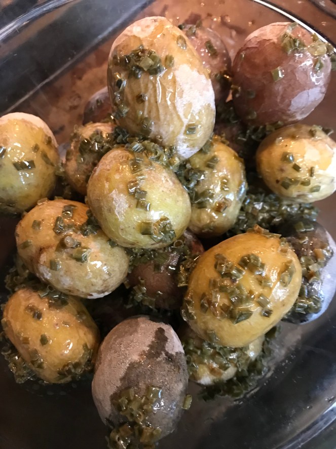 Place potatoes in a bowl (they should still be hot). Pour butter and chive mixture over the potatoes. Gently stir to coat the potatoes.